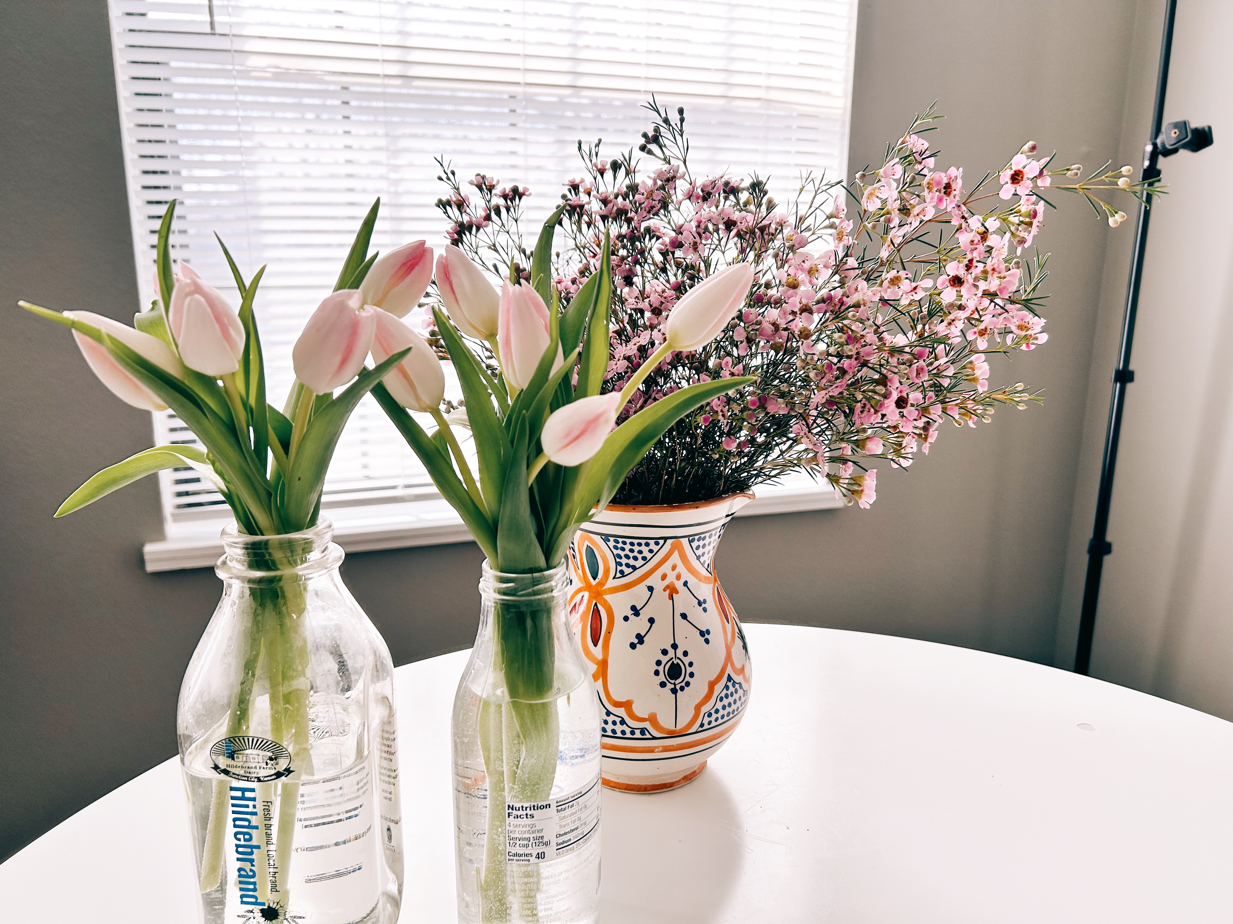 但我依然喜欢被植物环绕的环境,所以就开始买花。只要进城去缺德舅,我都会买一两束当季的花。今天去缺德舅发现郁金香上市了,粉嫩粉嫩地,十分可爱。我买了一束粉白色的郁金香,又挑了一束同色系的wax flower(腊花)。