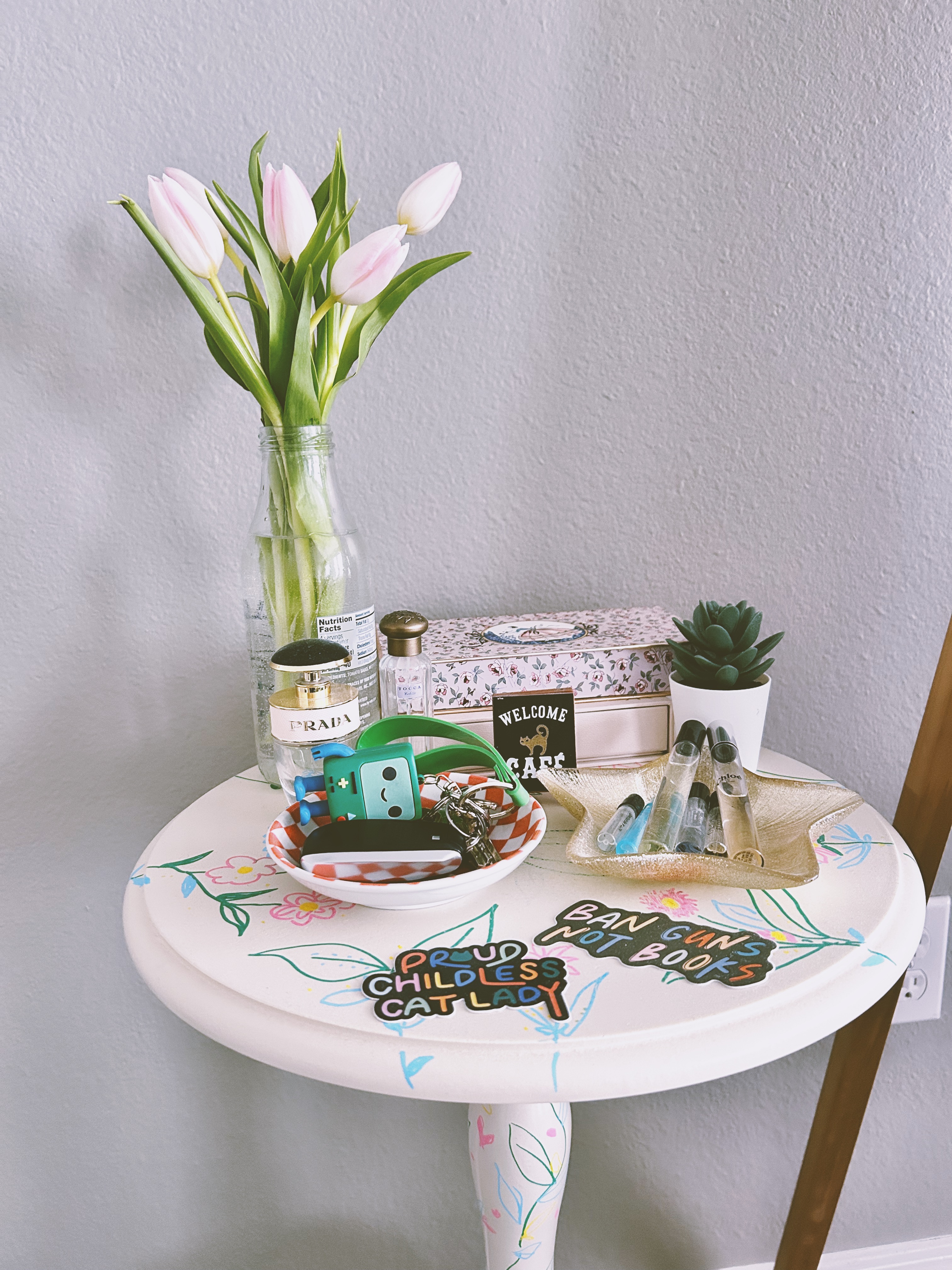 其中一个瓶子我放在门口的小桌子上,桌子面上还摆着日常出门要用的香水,钥匙,和两个小小的首饰盒(其中一个还是从比利时买回来的巧克力盒子)。